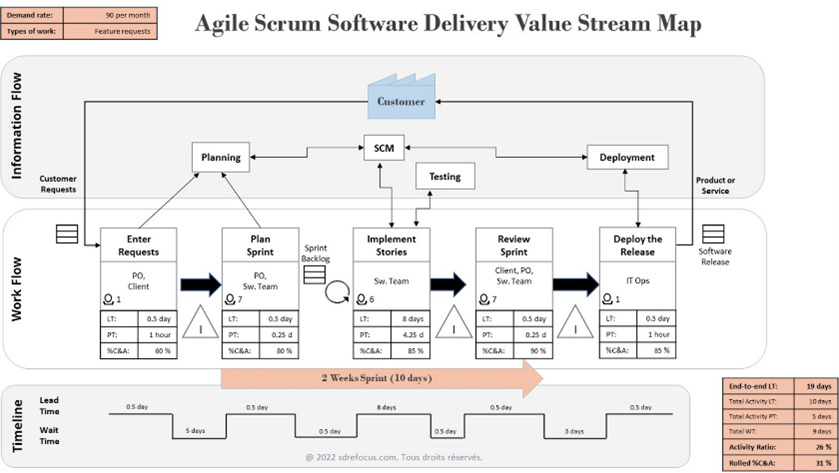 Then, when we visualise the existing or desired flow of work on a Value Stream Map, we represent the “release” as a product and use an “action verb-noun” format to clearly identify macro activities or processes like for instance “prepare the release”, “deploy the release”, or “open the release to end users” :